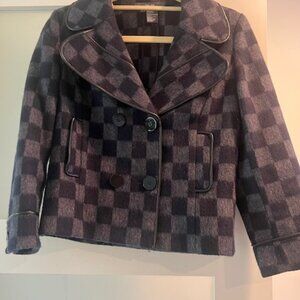 Be stylish in this wool jacket by Per Se. Blue and gray checks accented by faux leather trim on collar, pockets, cuffs and back of jacket. Size 4. Jacket is in great condition.