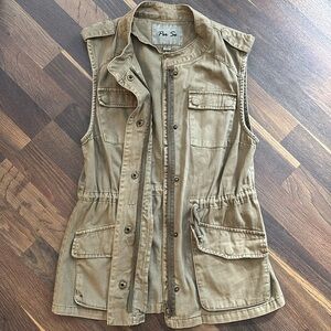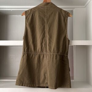 Stylish olive green utility vest. Features front pockets and drawstring waist. Perfect for layering.