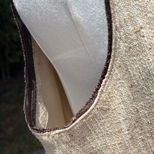 Chic, easy to wear sleeveless midi dress with a flattering V-neckline. Style lends itself to elevated office and cocktail settings. Perfect for special events like concerts, fundraisers, luncheons, meetings, interviews. Refined palette of light golden beige with brown woven accents. Fabric label states "silk canapa" -- canapa is Italian word for hemp.