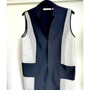 ✨ Keywords: Per Se vest, sleeveless tunic, button-down layering piece, mesh panel vest, minimalist fashion, gallery chic, architectural style, size 4, modern streetwear, capsule wardrobe, designer, high end, eclectic, unique