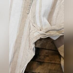 *please note this is petite in size. these pants have a wide leg/Palazzo design to them overall. has a drawstring waistline. there is also elastic in the waistline. there is pockets on each side. the stripes are vertical in different sizes and designs. the main background color is white. the stripes are Ina tan/wheat color. these pants are made 55% of linen so it does have the linen look but not the exact feel of linen. there is pockets on the back also. found no issues or flaws. smoke-free home and dog only pet home.