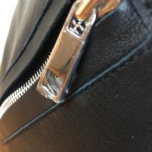 Wear this simply cool jersey/leather dress with a low rise leather skirt and zippers. Back has exposed zipper. Everything about this dress is understated and elegant. Wear this when you want to make a statement.