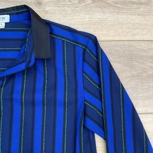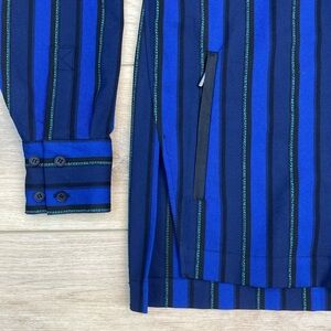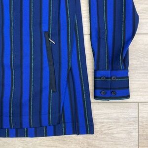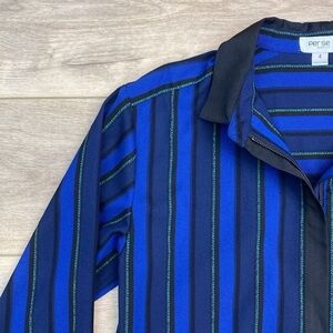 Blue and black striped zip up lightweight collared shirt jacket by Per Se Carlisle. A contemporary and unique shirt style jacket shacket that’s perfect for layering. The front features a two pull zipper, side slits and two ribbon trimmed zipper pockets. The textured stripe pattern features lime green accents that add modern contact to the cobalt blue and black base. In like new condition, the zipper pulls are still wrapped in protective plastic. Size 4