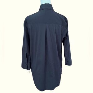 Trim around collar is black silk. Two flap chest pockets, post with hole for top button as shown, button front with placket covering the buttons, 3/4 sleeves with button cuffs. Lace up sides with silver hardware at ends. Cotton, nylon, and spandex blend, sleek feel. Approximate measurements are pit to pit 20”, length from shoulder approximately 26.5-28”, longer in back. Great little twist on a basic black blouse!!