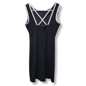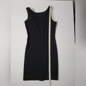 Chic black sleeveless dress with white trim. Perfect for any occasion.