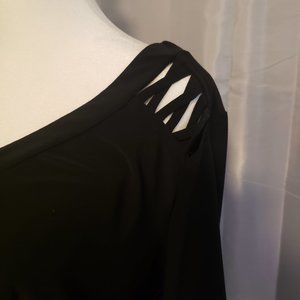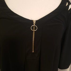 PerSeption Concept Black Pullover Top Short Goldtone Zipper at Neckline Size XL. Elbow sleeves. Peek a Boo slits at shoulders. No fading or stains. Great top.