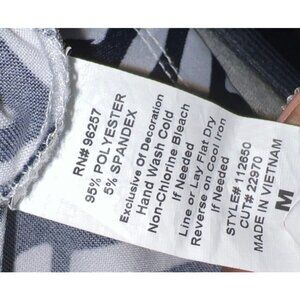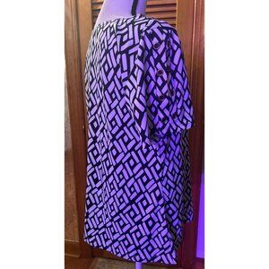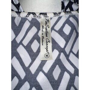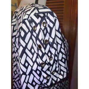 PerSeption Concept Black & White Geometric — Medium. Soft, flowy, with a V-Neck opening at the neckline, circle grommets are at neckline and sleeves, blouse is softly pleated at shoulders and grommets are double-lined on sleeves. Measurements: Bust: 41”; Length: 24”; Sleeves: 8”