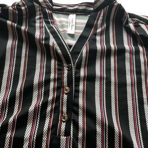 PerSeption Concept black blouse with stripes of color (red,orange, and white) vneck with three gold buttons on front with 3/4”sleeves with button
