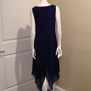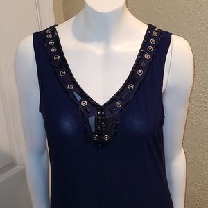 Navy stretch metal/bead Embellished v-neck sleeveless dress with asymmetrical sheer hemline.