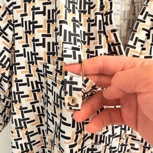 Chic top with an eye-catching pattern. Ideal for both work and casual wear. Features a classic design. Stretches. Two pockets on chests. Gently used. Good condition.