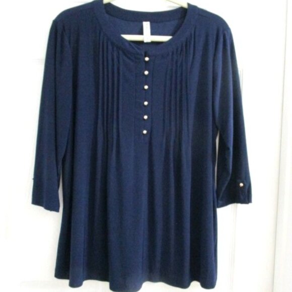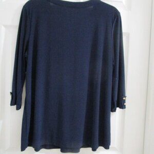 PerSeption Concepts Navy Blue 3/4 Sleeves Size XL. Gold tone buttons down the front and sleeve cuffs. Flowing pleats on each side of the buttons which fasten with little loops. Fabric 95% polyester and 5% spandex. So comfortable.
