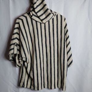 Navy blue and cream cotton hooded tunic. Front pocket, v neck, short sleeves with button roll up. Chest 25" length 25". Z