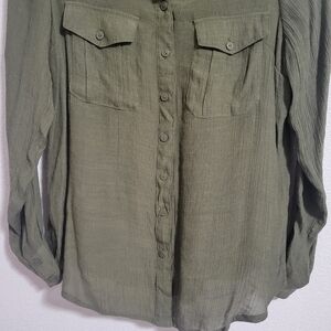 Perception Concept Simi sheer top size medium see pics for verification of size used no holes or stains or pilling measurements approximately flat lay pit to pit 20 length 26 sleeve 24 roll up sleeve details