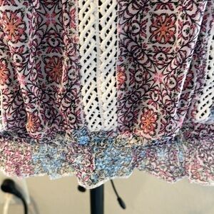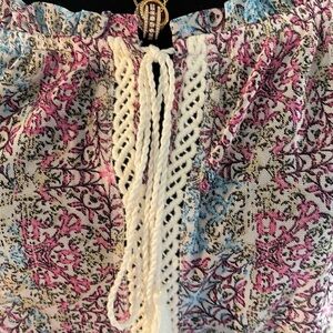 Reception Concepts blouse. This blouse has an elastic bottom. It also has a pretty tassel tie you can leave u ties if you wish. The sleeves are slit as shown in pics. So cool and flowy. Great condition.