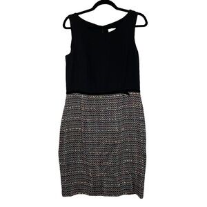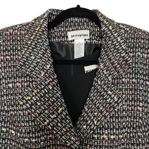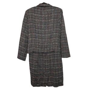 This Perceptions 2 piece matching dress and blazer set is a classic take on the Channel style with a vintage feel! The blazer has a confetti tweed design with velvet covered buttons and velvet bows on the two front pockets. It is fully lined and has slightly padded shoulders. Underneath is a beautiful sleeveless black and matching tweed dress with a velvet ribbon around the waist with a bow accent. It is a half zip back and has a small slit on the bottom of the skirt in the back. Both the jacket and skirt part of the outfit are lined. This is a stunning set that is a definite power statement piece to add to your wardrobe that still invokes a classic Jackie O. Style. This dress can be worn anywhere from the workplace to a Special event such as a wedding or other social event. The size is a 12 . Please refer to measurements when deciding to purchase. Thank you.๐ measurements are for the blazer PTP 21โ length 23โ sleeve 24 1/2โ measurements for the dress is PTP aprox. 20 1/2โ waist 16 1/2โ total length 39โ top part of dress from shoulder to waist is aprox. 16โ and the skirt portion of the dress from the waist to the bottom hem is 23โ.