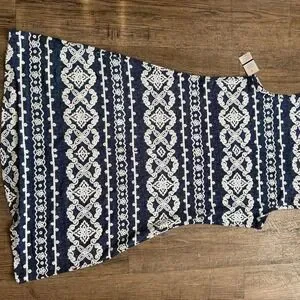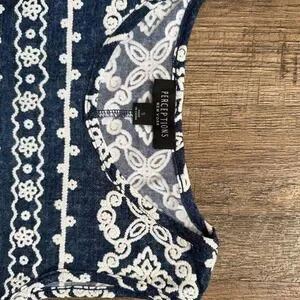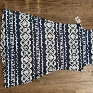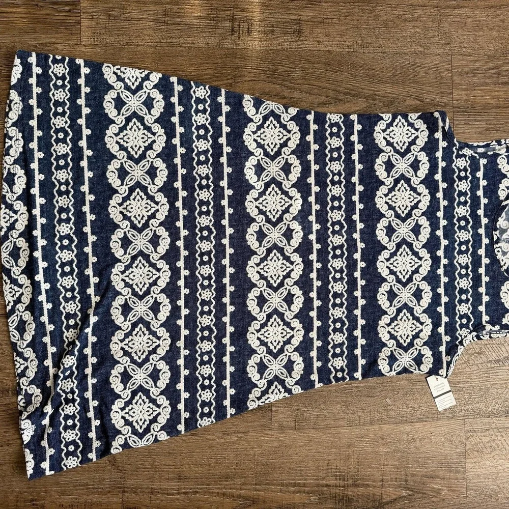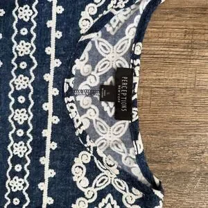 Perceptions Sleeveless Printed Shift Dress, Blue and White Pattern, Women's Size S. This stylish dress features a striking blue and white Moroccan-inspired tile and floral geometric print. The sleeveless shift silhouette offers a comfortable and versatile fit, perfect for casual outings or office wear. The fabric has a textured feel similar to a soft knit or denim-look jersey. Brand new with tags attached. No flaws, stains, or signs of wear.