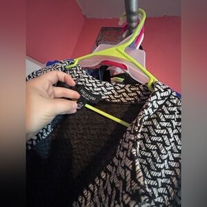 Stylish black and white patterned blazer with flared ruffle hem. Open-front design for easy layering. Soft textured knit adds visual interest. Versatile piece for dressy or casual looks.