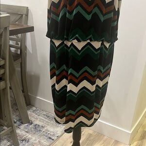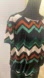Stylish chevron patterned dress featuring a blend of vibrant colors: Greens, ivory, black, brown.