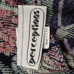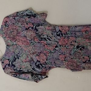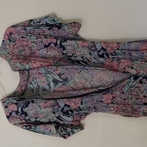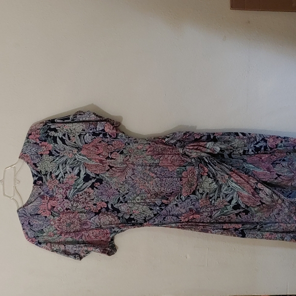 Perceptions Size 11-12, Black base dress with floral print in pink, lilac and mint green. Pit to pit 18 inches. Should to hemline 45 inches, with an 8 inch slit in back.