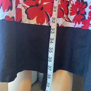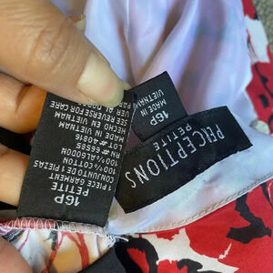 This beautiful Perceptions dress features a stunning floral print in black and white. The V-neckline and ruffle accents add a touch of elegance to the knee-length A-line dress. The dress is made of a lightweight cotton blend fabric, making it perfect for summer and spring travel or casual occasions. It has a zip closure and is machine washable for easy care. The dress is a size 16P and is suitable for petites. The dress is not personalized and has no vintage elements. The dress is made in India and is perfect for those who appreciate fashion with a flower theme.