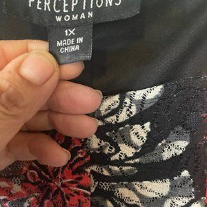 Very nice pre-owned dress in very good condition. Dress is by Perceptions Woman. Size 1X and sleeveless. Paneled which makes it flowy in the bottom. Lace all around with lining. Print is red flowers on a white and black background.
