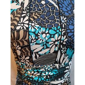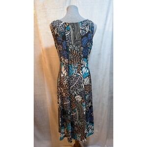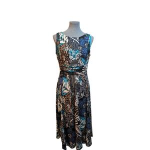 Keywords: floral dress, midi dress, sleeveless dress, womens dress, multicolor dress, Perceptions New York, casual dress, party dress, work dress, abstract print, ruched waist, comfortable dress, stylish dress, size M dress, modern dress