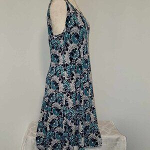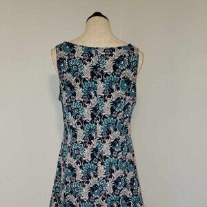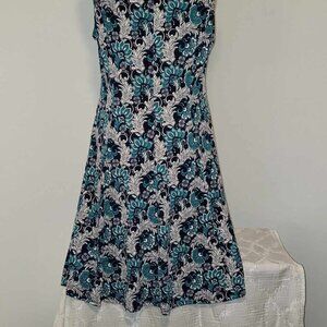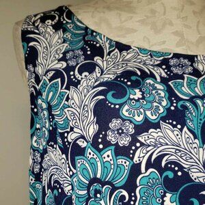 This gorgeous dress is from Perceptions N.Y.. Navy with white & teal print. Scoop neck. Sleeveless. Flared skirt. Stretch material.