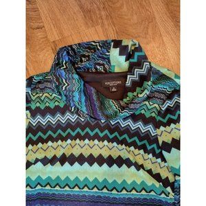 Cowl Neck Sweater Dress by Perceptions New York, size M. 3/4 sleeves. Design is a Green Blue Zig Zag. Polyester/spandex. Great as a dress or tunic over leggings. Dress up for work or dress down for casual. Very easy to pack for travel. In excellent pre-owned condition.