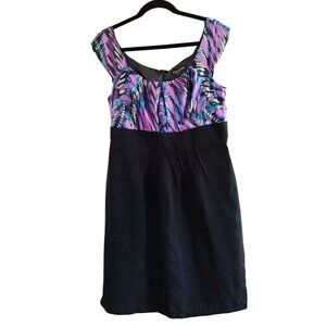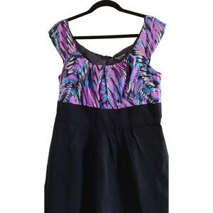 evening dress, cocktail wear, formal event, pleated skirt dress, cap sleeve dress, classy evening, office party, chic attire, back zip dress, multicolor bodice, stylish cocktail, semi-formal dress, wardrobe essentials, black and purple dress