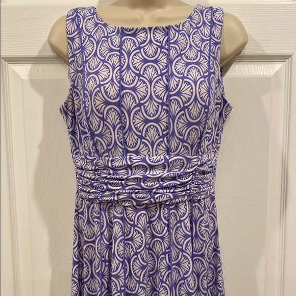 Elegant stretchy purple and white dress with a striking pattern, cinched waist front by Perceptions. Perfect for any occasion. In like new condition. Measurements: 45 Length, bust 36 and waist 28-32+