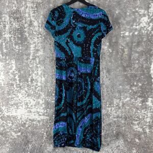 Perceptions Size 10 Midi Faux Wrap Dress Blue Black Short Sleeve V Neck Stretch