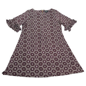 Ruffle Detail on Sleeves. Zipper Closure. Color is a deep purple (listed as *Wine* on the tag) with white and gray details that make the pattern 95% Polyester 5% Spandex.