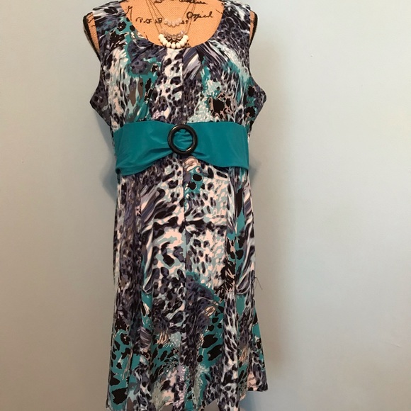 Size petite extra-large. Scoopneck with no sleeves, beautiful colors with a piece in the front that is very slimming.Washed and ready to wear! Dress this up or down.