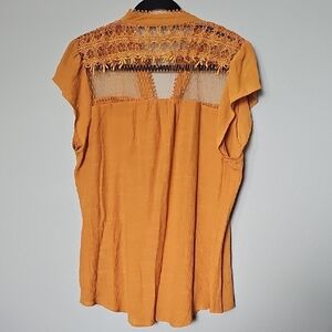This elegant blouse showcases a marigold / mustard yellow hue, complemented by a mandarin collar and cap sleeves. The intricate lace embellishments add a touch of sophistication, making it a versatile piece for any occasion. Crepe/ gauze like crinkle fabric. Very lightweight, doesn't stretch. A couple of buttons at the chest. Lightly sheer and great condition. Great for the office, workplace, interview, date night, dinner, brunch, career, weekend, romantic, boho, cutwork, feminine, fall pop of color, autumn, girly, feminine, sweet, twee.