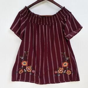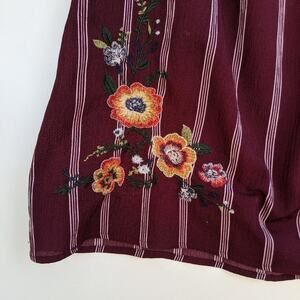 Features: maroon, burgundy, pin striped, floral, embroidery, elastic neck, short sleeve, wide sleeves, red, orange, blu pepper.