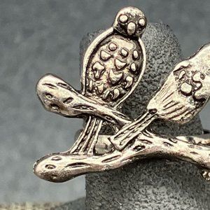 Beautiful double ring with four birds perched on a branch, highly detailed, one with rhinestone sparkle, silvertone with two adjustable bands, currently at about size 6 each. Mother bird caring for her brood. Could also work as a scarf clip/holder!