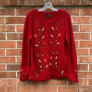 Perez Baby Alpaca Wool Cardigan Sweater Sz Large, Red Floral Embroidered, Vintage, Made in Peru, in great pre-owned condition