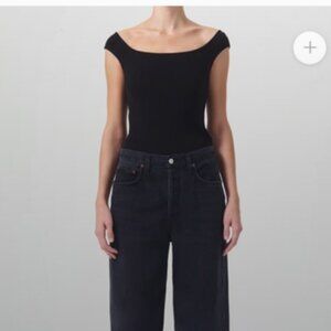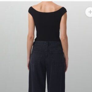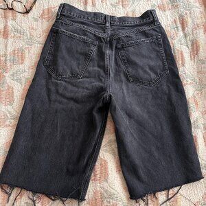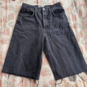 Amazing 90s style cutoffs made from faded black Agolde Dara jeans. Slouchy and soft. Please note that tag says 24 but I am normally a size 26 and these fit loosely (as intended), not tight -- could probably fit a 27 as well. The shape is similar to other Agolde wide-leg looser fit jeans, but the waist on these is higher. Black is subtly faded (appears darker in stock pics) and they are cut off with a raw hem but could easily be hemmed. Bought new as jeans from Mohawk General in LA for full price.