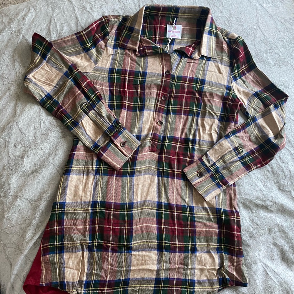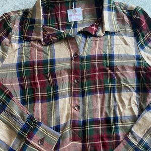 Lightweight button down, perfect for layering or by itself! Plaid includes reds, blues, greens, and yellow so easy to match with anything. It unfortunately did not fit me so brand new with tags!