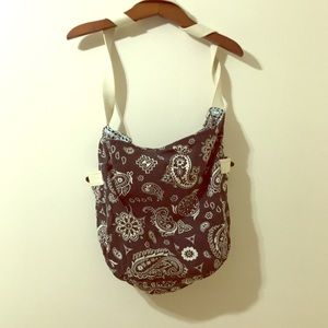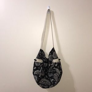 Lightweight canvas material and lined with contrasting cotton fabric. Strap drop is about 15”. Bag itself measures approx. 13” x 12” x 5”. Easily packable for taking on trips. Two exterior pockets adorned with black buttons. Interior zip pocket. Sturdy and can carry nearly anything. Great for on the go.