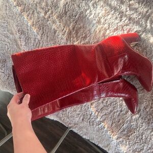 Perfect Condition Red Croc-Embossed Knee-High Boots
