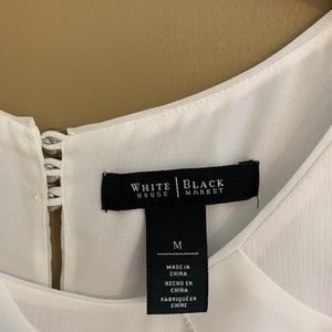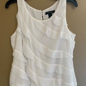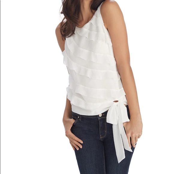 Perfect condition. WHBM white ruffle top with tie and silver detail buttons in back. Super cute on its own or under a blazer. Size Medium.