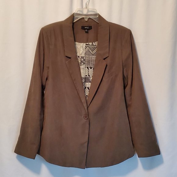 This blazer is great... pretty light, but has a micro-suede? type fabric, so it is fantastic for fall. It looks great with rolled sleeves, too. The color is best seen in the second, closer up image: a grey-green-brown. Size Medium (so, 6-ish). Self: 100% polyester, contrast: 100% cotton. Machine wash cold, gentle cycle or hand wash; can also dry clean.