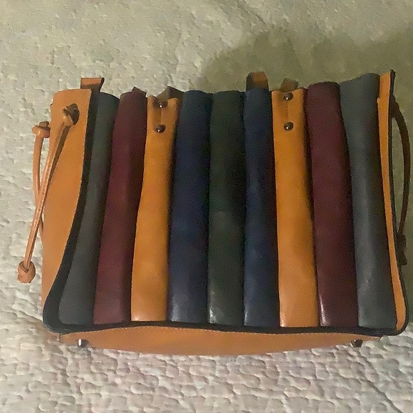 New, never used, multi-colored handbag. Dark green, dark blue, burgundy and tan. 13” wide x 9 1/2” x 5”. 9 1/2” strap drop. Unlined, no pockets. Second, smaller bag inside. 11 1/2” x 9” x 4”. One pocket, one zip pocket and shoulder strap included. Same tan color as bottom and ends of larger bag. No brand name. Non-smoking home.