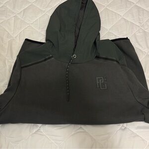 Stylish gray hooded sweatshirt featuring a front pocket and logo detail. Perfect for casual wear.