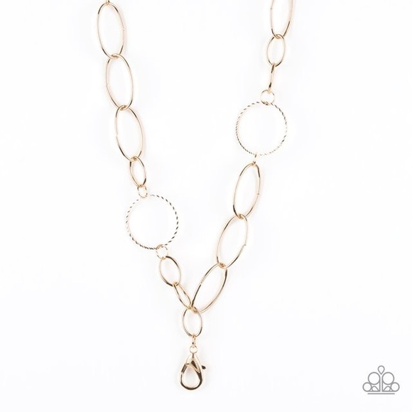 Perfect MISMATCH| An array of smooth and textured gold hoops connect across the chest, creating a bold mismatched palette. A lobster clasp hangs from the bottom of the design to allow a name badge or other item to be attached. Features an adjustable clasp closure.