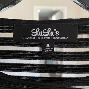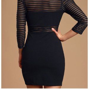 Really cute and sexy black mini-dress with mesh striped detailing. Great for formals, cocktail parties, clubbing, etc. Very good condition.