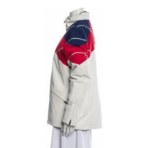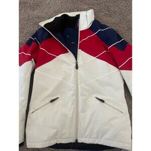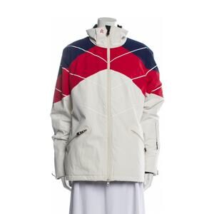 Features long sleeves with zip pockets, stand collar, front two-way zipper closure, side zipped pockets, interior zipper pockets, red and blue colorblock pattern, white stripes, interior elastic hem, and powder skirt. Shell: 90% Polyester, 10% Lycra. Upper Body / Sleeve Lining: 100% Polyester. Lower Body Lining: 100% Nylon. Fill: 100% Polyester. Made in China.