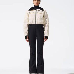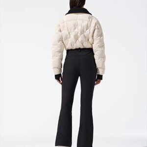The Helen Ski Suit seamlessly blends style with performance, combining the warmth of a jacket with the functionality of ski pants. The top of the suit is filled with 700-power fill down, featuring a ribbed high neck collar and cuffs for exceptional warmth. Crafted with advanced Toray Dermizax technology, this suit ensures water-resistant breathability for your comfort. The 4-way stretch fabric offers fluid movement, while adjustable zippered boot hems and integrated snow gaiters provide ease over ski boots.