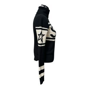 Premium designer ski sweater by Perfect Moment featuring bold SKI lettering and star sleeve accents in a striking black and white palette. Made from a soft, warm wool blend (Inner tag removed but consistent with the brands signature merino-cashmere mixes), this fitted turtleneck is perfect for après-ski lounging or a winter city look. High neck and ribbed cuffs and hem add warmth and structure.